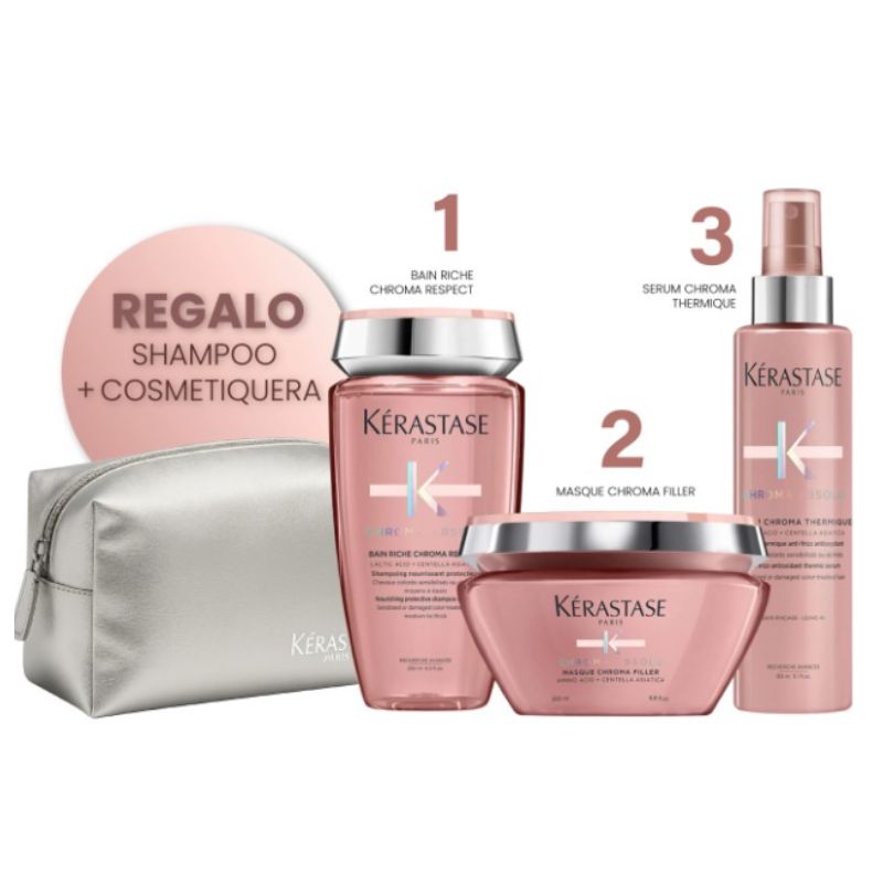 | SHAMPOO BAIN RICHE CHROMA RESPECT: Champú protector y nutritivo para cabellos coloreados, sensibles o dañados. Su fórmula altamente nutritiva cuida los cabellos de medios a gruesos respetando y preservando su color. Sin sulfatos. MASCARILLA MASQUE CHROMA FILLER: SÉRUM CHROMA THERMIQUE: |