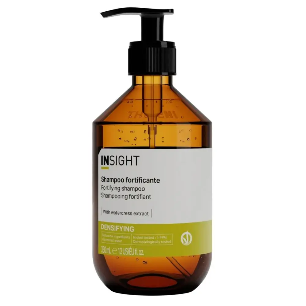El champú densificante INSIGHT está elaborado con un fitocomplejo compuesto por extracto de castaño de Indias orgánico, extracto de guaraná y extracto de berro, que actúa sobre la raíz fortaleciendo el cabello y el cuero cabelludo.